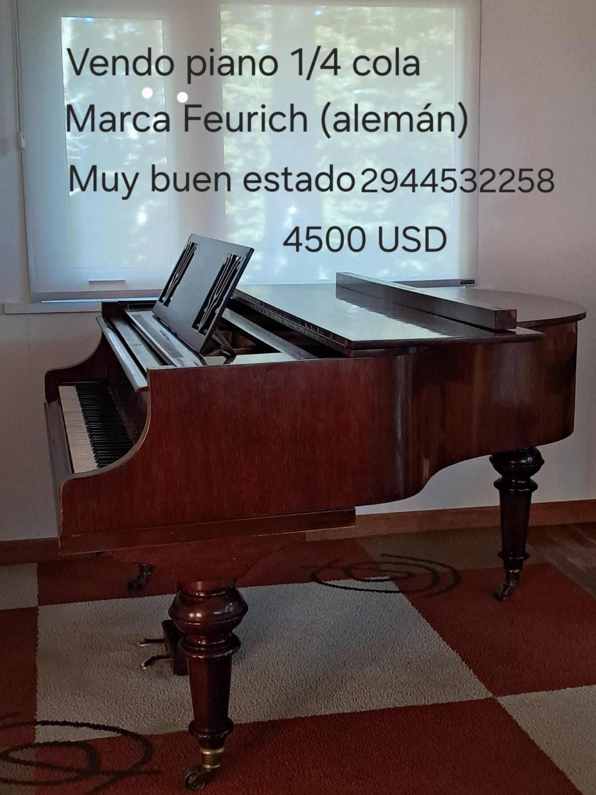 Vendo piano 1/4 cola. Marca Feurich. muy buen estado. 4500 USD